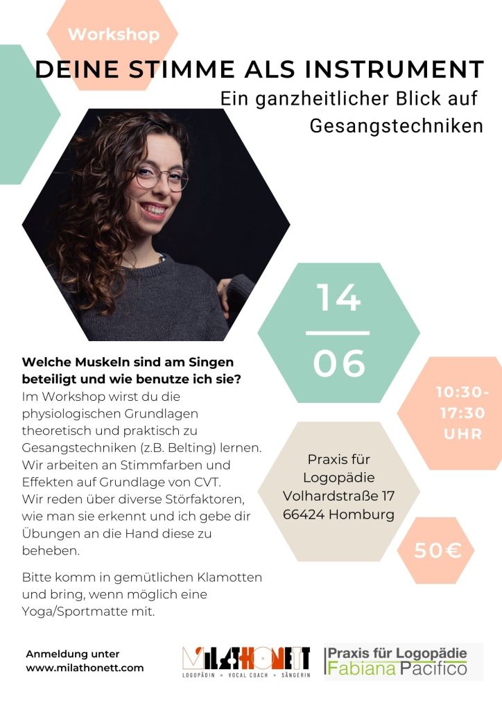 Als Logopädin und Sängerin bringe ich dir meine Sicht auf die Gesangstechnik bei, leite dich Schritt für Schritt an, um die verschiedenen Techniken zu erlernen und physiologisch umzusetzen.